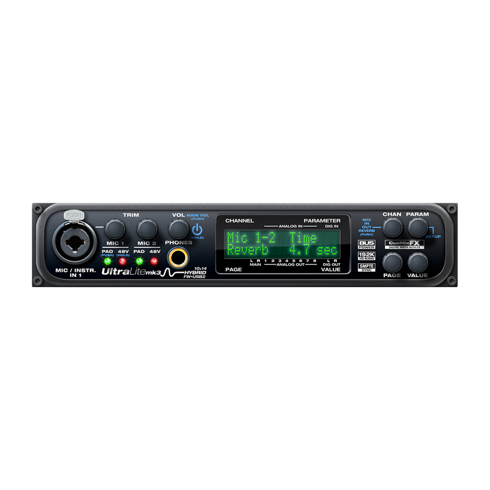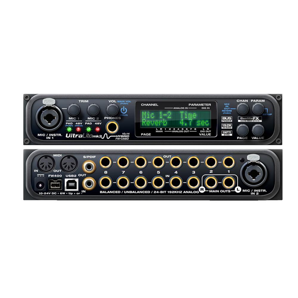 این کارت صدا با نرخ نمونهبرداری تا 192kHz و مبدلهای دیجیتال با کیفیت بالا، صدایی شفاف، دقیق و حرفهای را ارائه میدهد. علاوه بر این، یکی از نقاط قوت اصلی UltraLite-mk3 Hybrid، وجود DSP داخلی با امکان پردازش افکتهایی مانند EQ، کمپرسور، ریورب و… به صورت real-time است که به خصوص در اجرای زنده بسیار کاربردی است.